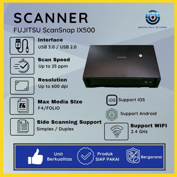 Fujitsu ScanSnap IX500 adalah scanner portable berkecepatan tinggi hingga 25 ppm dengan fitur duplex otomatis dan dukungan koneksi WiFi. Scanner ini mampu memindai dokumen hingga ukuran F4 (Legal/Folio) dan menghasilkan hasil yang tajam serta profesional.